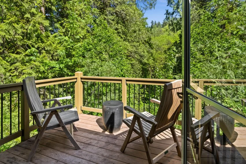This spacious room on the second floor of the Lodge features a king-size bed and a private bath with a vintage soaking tub and a separate shower. The bedroom opens to a private balcony overlooking the lawn and Raging River. With its luxe amenities, ample space, and forest views, the Cedar Suite is a popular alternative to staying in a treehouse.