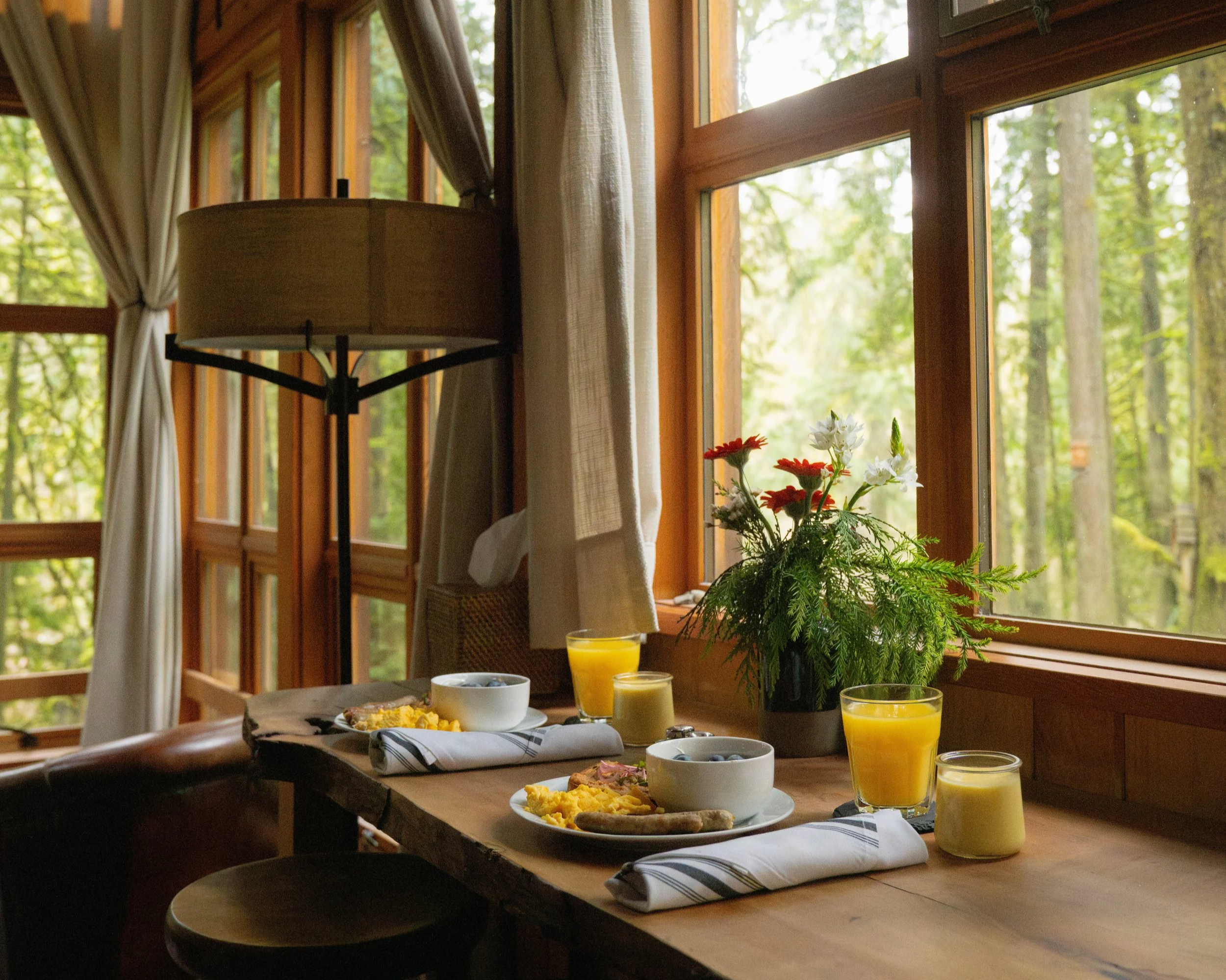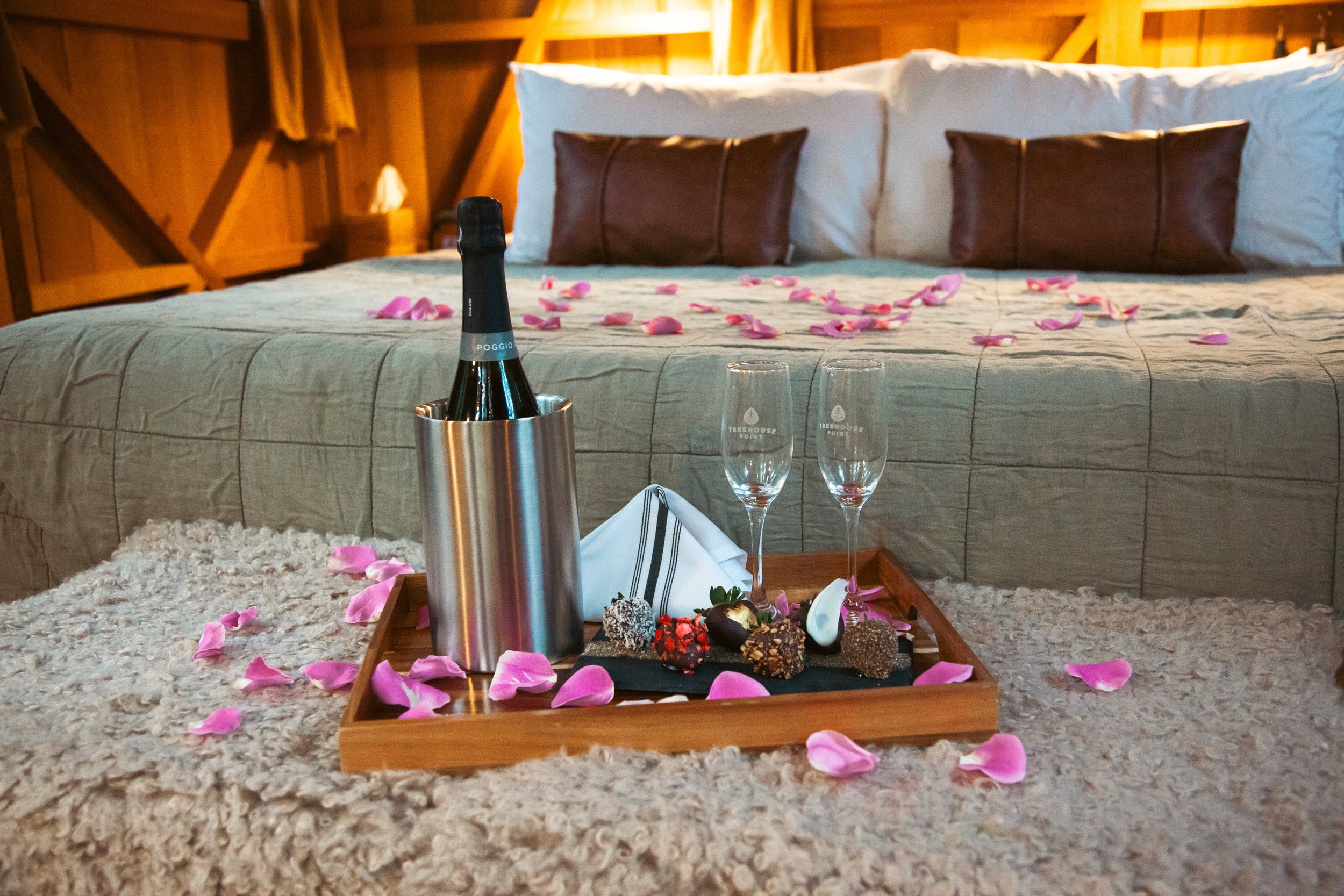 Another delicious way to elevate your stay is with our Romantic Retreat Package. This sweetheart package sets the scene for an intimate night in the trees with rose petals scattered across the bed, a bottle of prosecco or wine for two, artisan truffles, and a morning mimosa the next day—everything you need for an unforgettable escape in the trees.