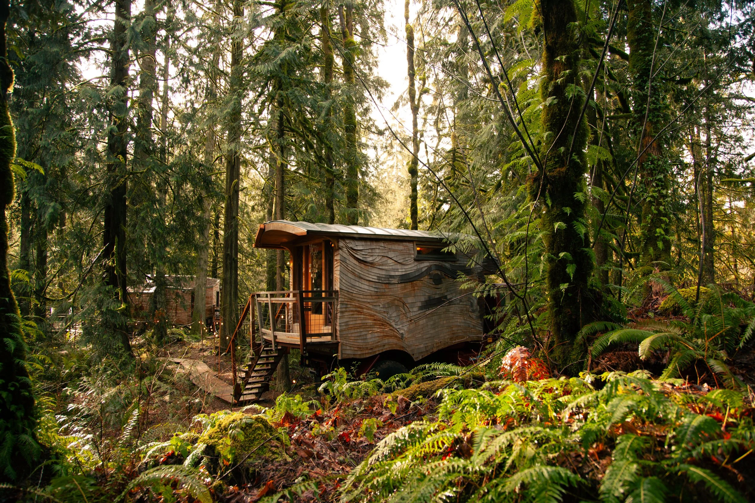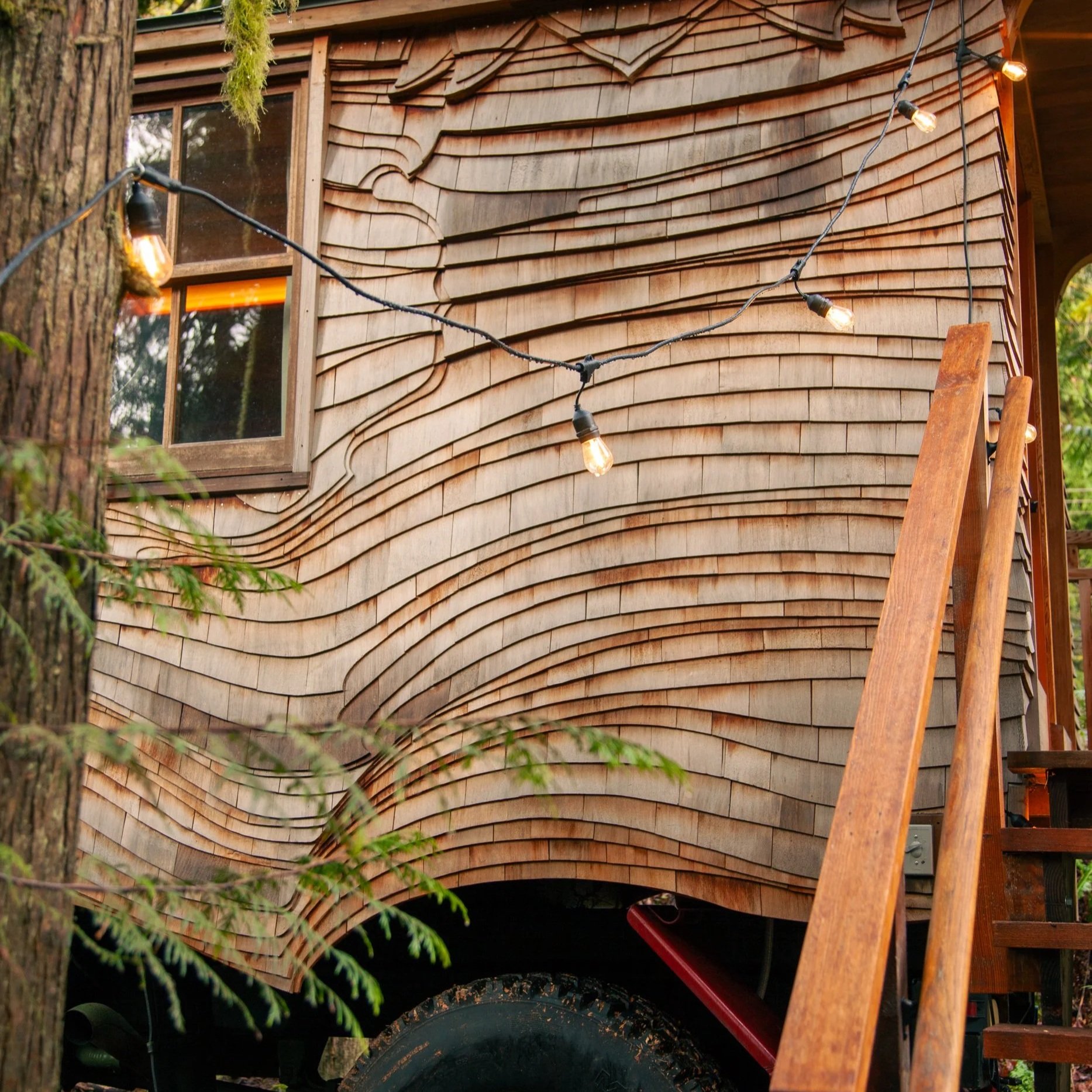 Our carpenters at Nelson Treehouse and Supply had a blast bringing the LoveBomb to life, including the artistic shingles—nicknamed swingles for their sweeping, swooping design. Truly, LoveBomb isn’t just a place to stay; it’s a piece of art you can sleep in.