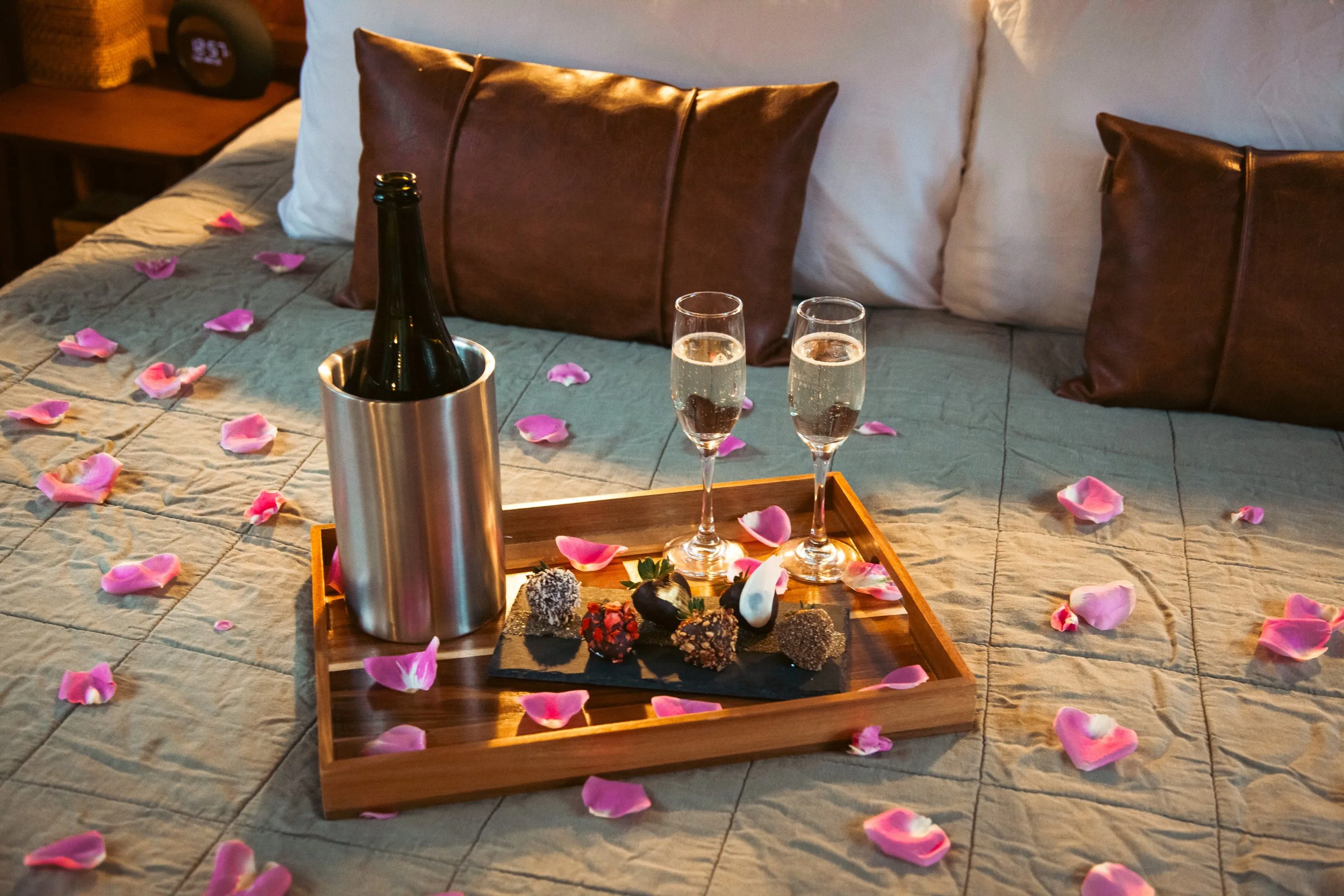 Now, these indulgent sweets can be yours. Add our Sparkles and Strawberries Package to your booking at check out to experience an evening with six house-made chocolate-covered strawberries, each with unique designs and toppings, a bottle of chilled premium champagne, and rose petals on the bed to set the mood.